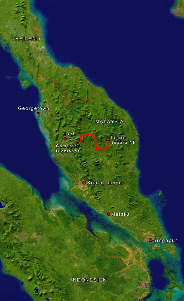 Der Himmel ist heute Morgen wolkenverhangen, als ich mich auf den langen Weg zur Rezeption mache, um auszuchecken. Nachdem ich den Schlüssel abgegeben habe, setze ich mit einem Fährboot nach Kuala Tahan über, schleppe mein Gepäck durch das halbe Dorf und erreiche schließlich das Auto. Der Koffer ist zum Glück noch da. Ich bin von der Anstrengung in der schwülen Luft schweißgebadet und kühle mich mit Hilfe der Klimaanlage erst einmal ein paar Minuten ab, bevor ich mich auf meinen heutigen Weg mache.