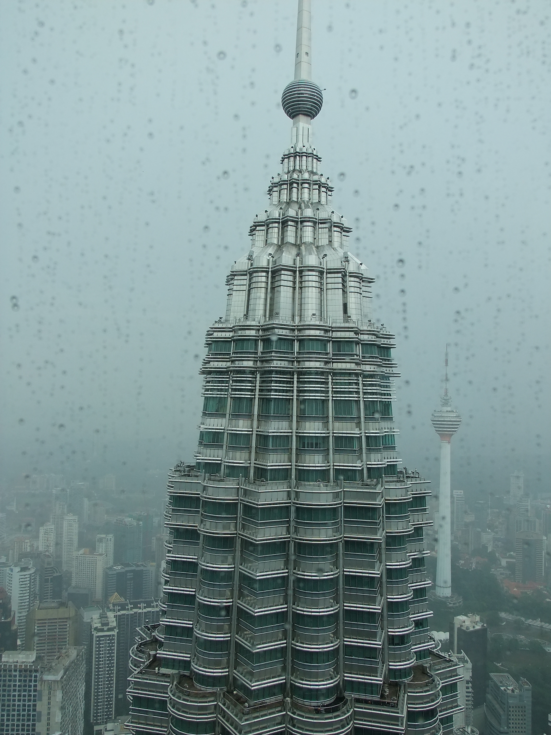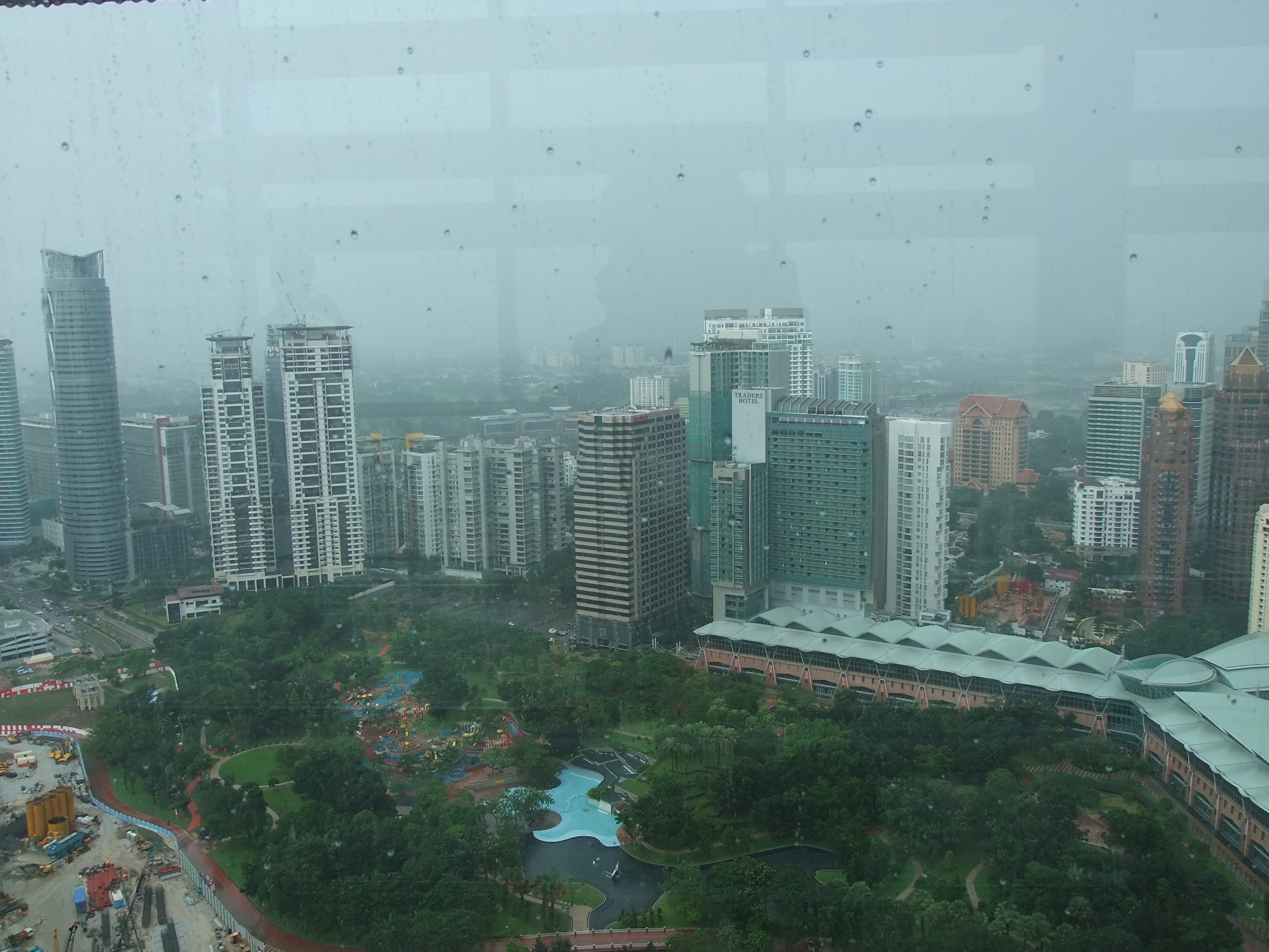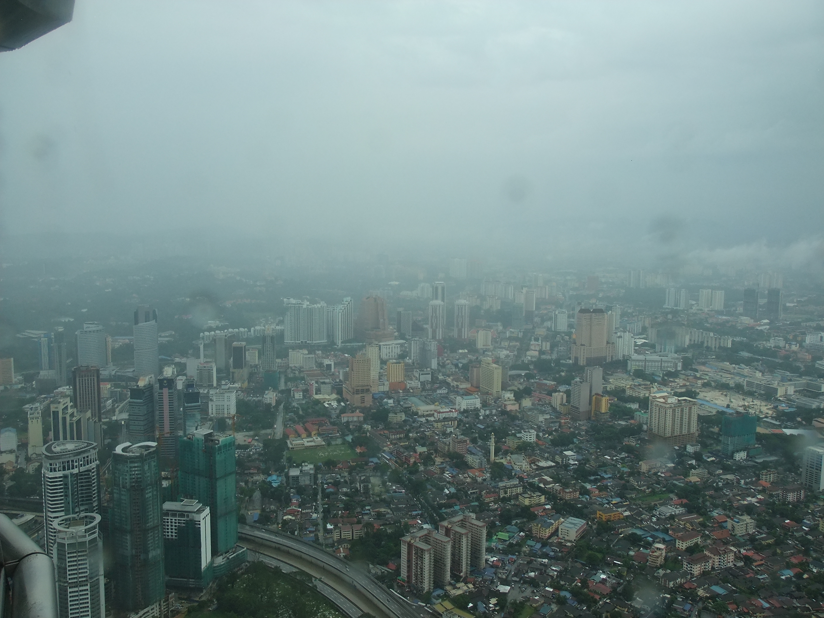 Am Nachmittag steht eine erste Besichtigung auf dem Programm: Ich habe schon vor vielen Wochen über das Internet eine Eintrittskarte für die Twin Towers reserviert. Sie gilt für heute um 17:00 Uhr und kostete 80 Ringgit. Ich habe die ausgedruckte Reservierungsbestätigung dabei, da ich aber nicht weiß, wie lange die Ausstellung des Tickets dauern wird, gehe ich etwas früher los. Das ist mein Glück, denn unmittelbar nachdem ich den Eingangsbereich der Türme erreicht habe, beginnt es in Strömen zu regnen. Obwohl ich die nächste Zeit im Inneren von Gebäuden verbringe, wirkt sich das schlechte Wetter auf meinen Besuch aus. Von Fernsicht kann keine Rede mehr sein. Und diese wäre bei schönem Wetter sicher sehr beeindruckend. Zunächst stehe ich mit etwa 30 anderen Besuchern in einer Schlange, dann müssen wir eine Sicherheitskontrolle wie am Flughafen absolvieren, anschließend werden wir mit einem Lift zur Skybridge gefahren, die in 170 Metern Höhe liegt. Trotz des Regens kann man von hier aus einen guten Rundblick über die Stadt genießen. Nach etwa 15 Minuten Aufenthalt erwartet uns der Höhepunkt, im wahrsten Sinne des Wortes. Ein weiterer Lift bringt uns in das 86. Stockwerk, auf 370 Meter Höhe. Aus dieser Distanz wirkt das Treiben auf den Straßen endgültig wie ein Blick auf einen Ameisenhaufen.