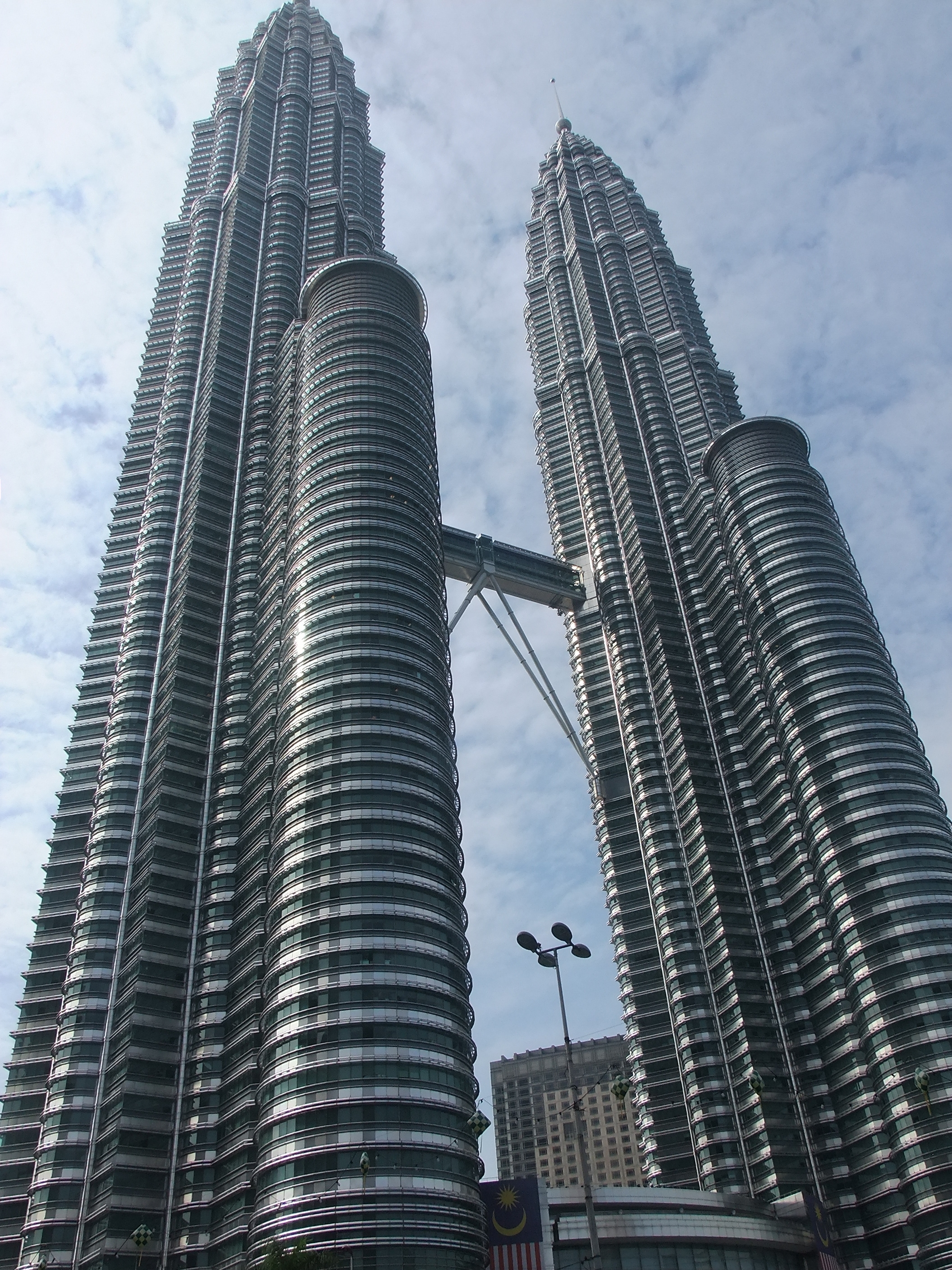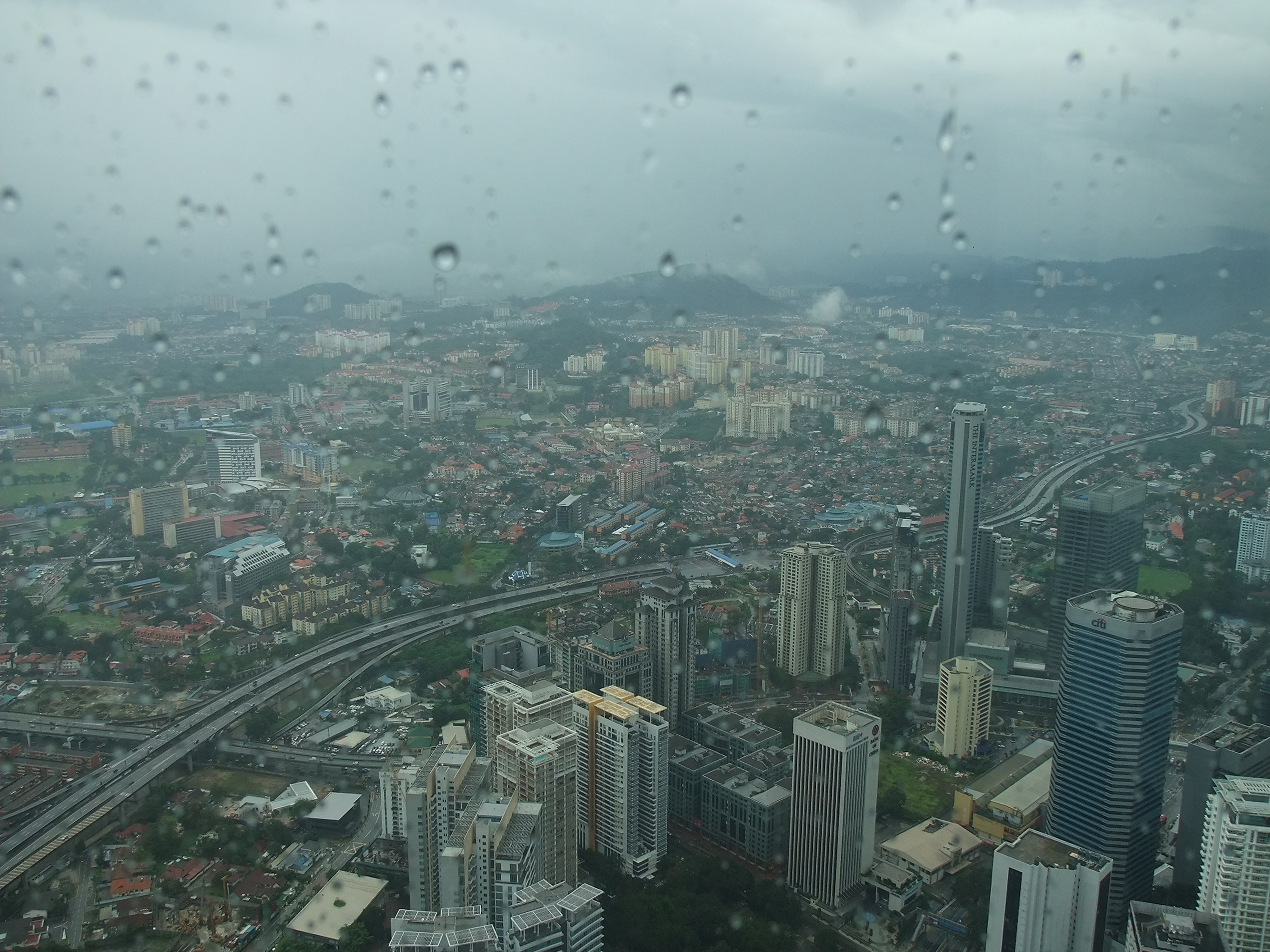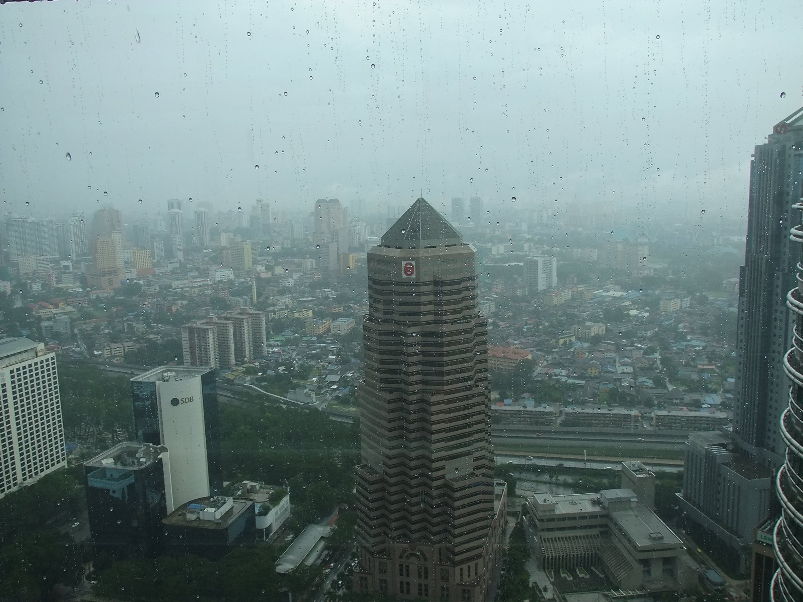 Am Nachmittag steht eine erste Besichtigung auf dem Programm: Ich habe schon vor vielen Wochen über das Internet eine Eintrittskarte für die Twin Towers reserviert. Sie gilt für heute um 17:00 Uhr und kostete 80 Ringgit. Ich habe die ausgedruckte Reservierungsbestätigung dabei, da ich aber nicht weiß, wie lange die Ausstellung des Tickets dauern wird, gehe ich etwas früher los. Das ist mein Glück, denn unmittelbar nachdem ich den Eingangsbereich der Türme erreicht habe, beginnt es in Strömen zu regnen. Obwohl ich die nächste Zeit im Inneren von Gebäuden verbringe, wirkt sich das schlechte Wetter auf meinen Besuch aus. Von Fernsicht kann keine Rede mehr sein. Und diese wäre bei schönem Wetter sicher sehr beeindruckend. Zunächst stehe ich mit etwa 30 anderen Besuchern in einer Schlange, dann müssen wir eine Sicherheitskontrolle wie am Flughafen absolvieren, anschließend werden wir mit einem Lift zur Skybridge gefahren, die in 170 Metern Höhe liegt. Trotz des Regens kann man von hier aus einen guten Rundblick über die Stadt genießen. Nach etwa 15 Minuten Aufenthalt erwartet uns der Höhepunkt, im wahrsten Sinne des Wortes. Ein weiterer Lift bringt uns in das 86. Stockwerk, auf 370 Meter Höhe. Aus dieser Distanz wirkt das Treiben auf den Straßen endgültig wie ein Blick auf einen Ameisenhaufen.