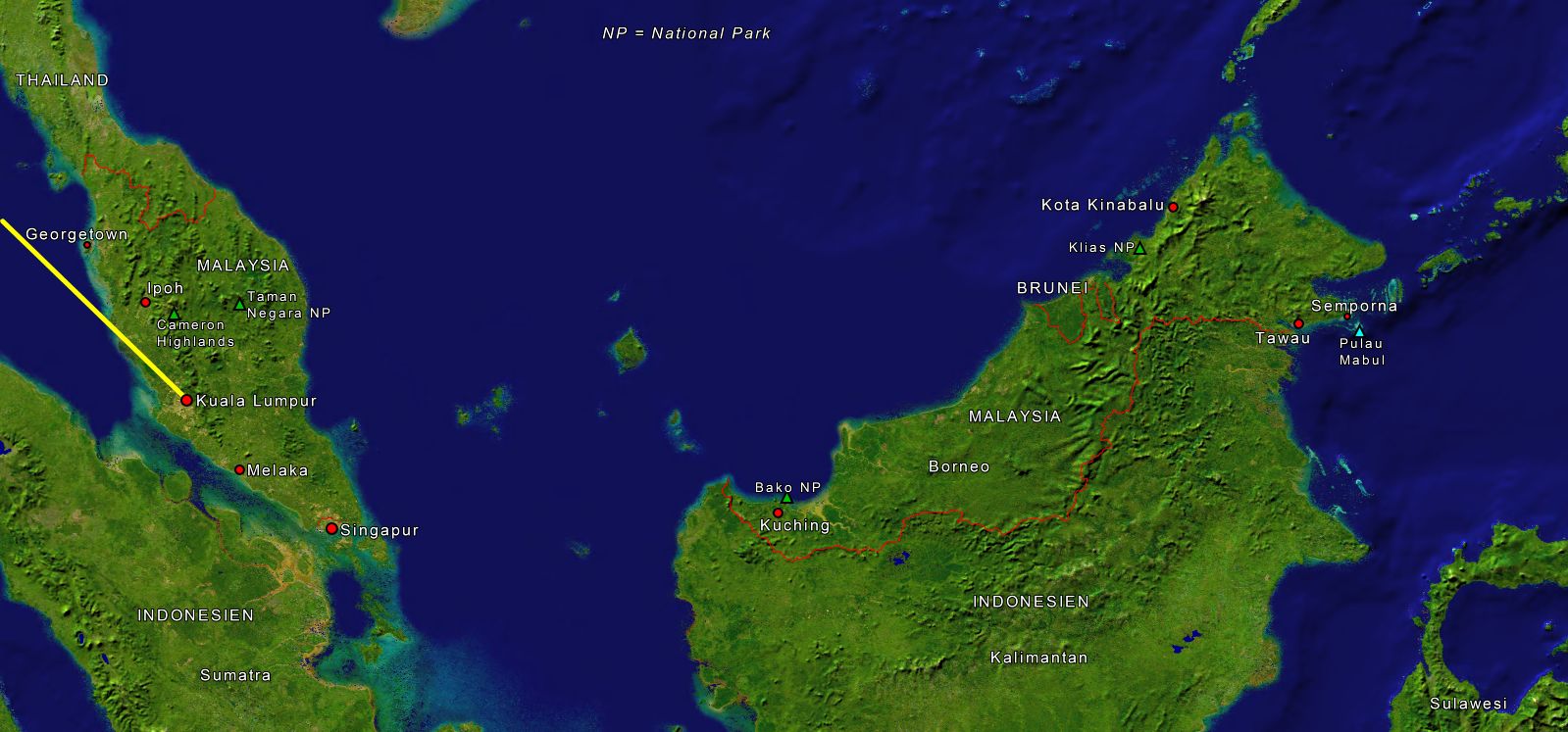 Selbst nach 20 Jahren gibt es für mich völlig unbekannte Länder in Asien zu entdecken. Zum ersten Mal in meinem Leben reise ich nach Malaysia. Das Abenteuer beginnt in einem ziemlich vollen ICE vom Kölner Hauptbahnhof zum Frankfurter Flughafen. Dort besteige ich drei Stunden später eine Boeing 777-200 der Malaysia Airlines. Der Start verzögert sich um etwa eine halbe Stunde, der Pilot schafft es jedoch, die Verspätung aufzuholen, sodass ich auf die Minute pünktlich auf dem Kuala Lumpur International Airport ankomme.