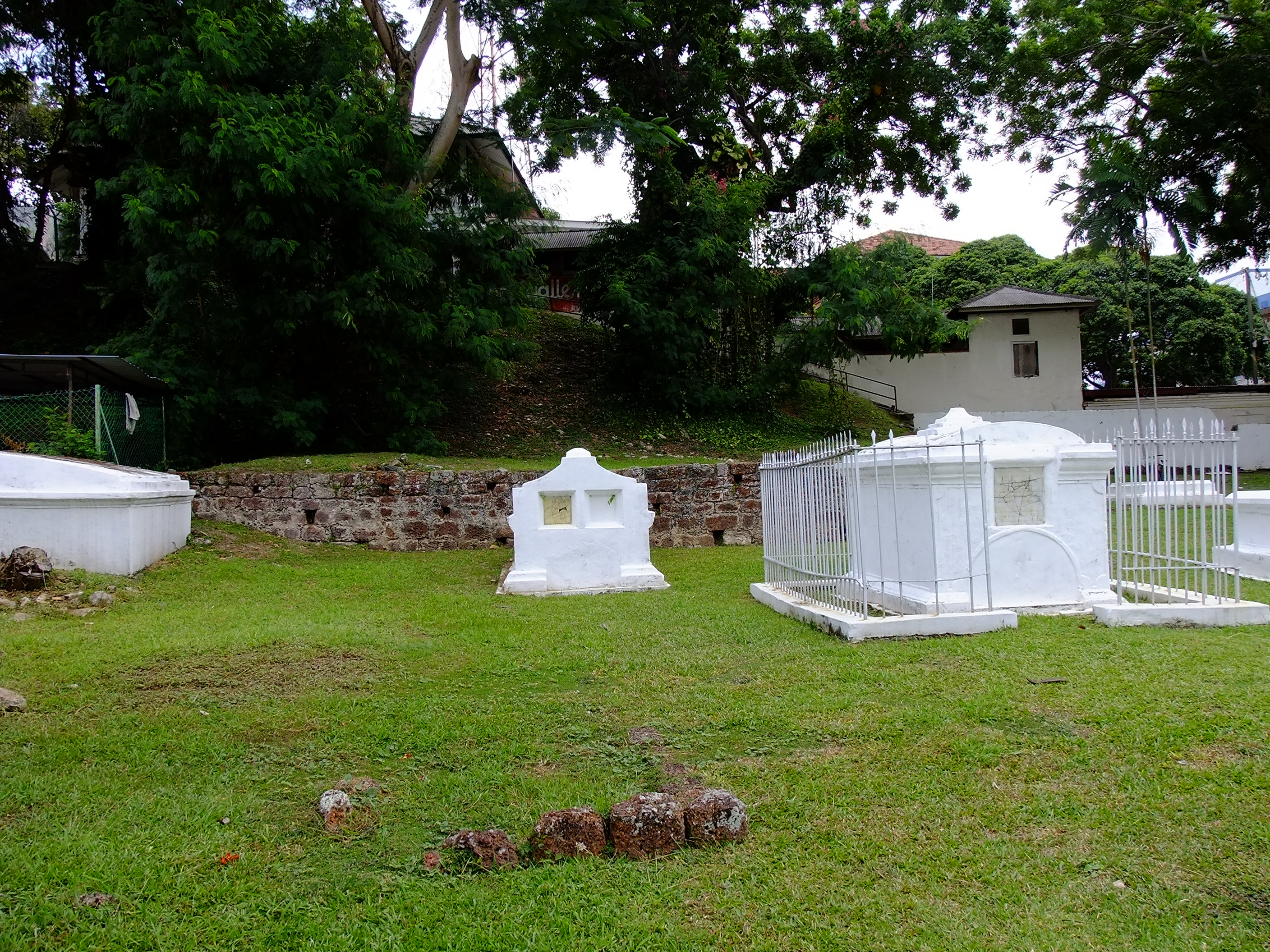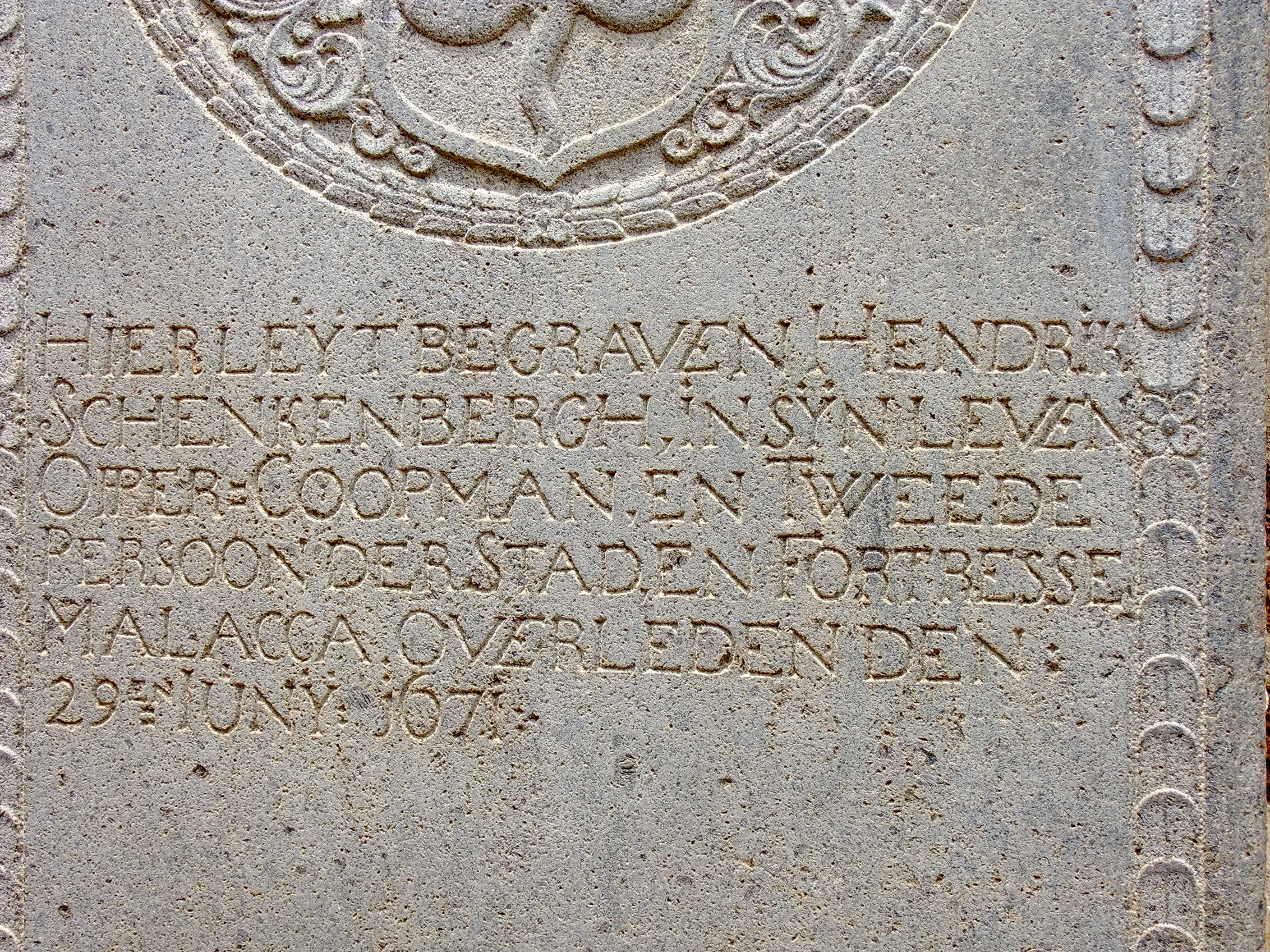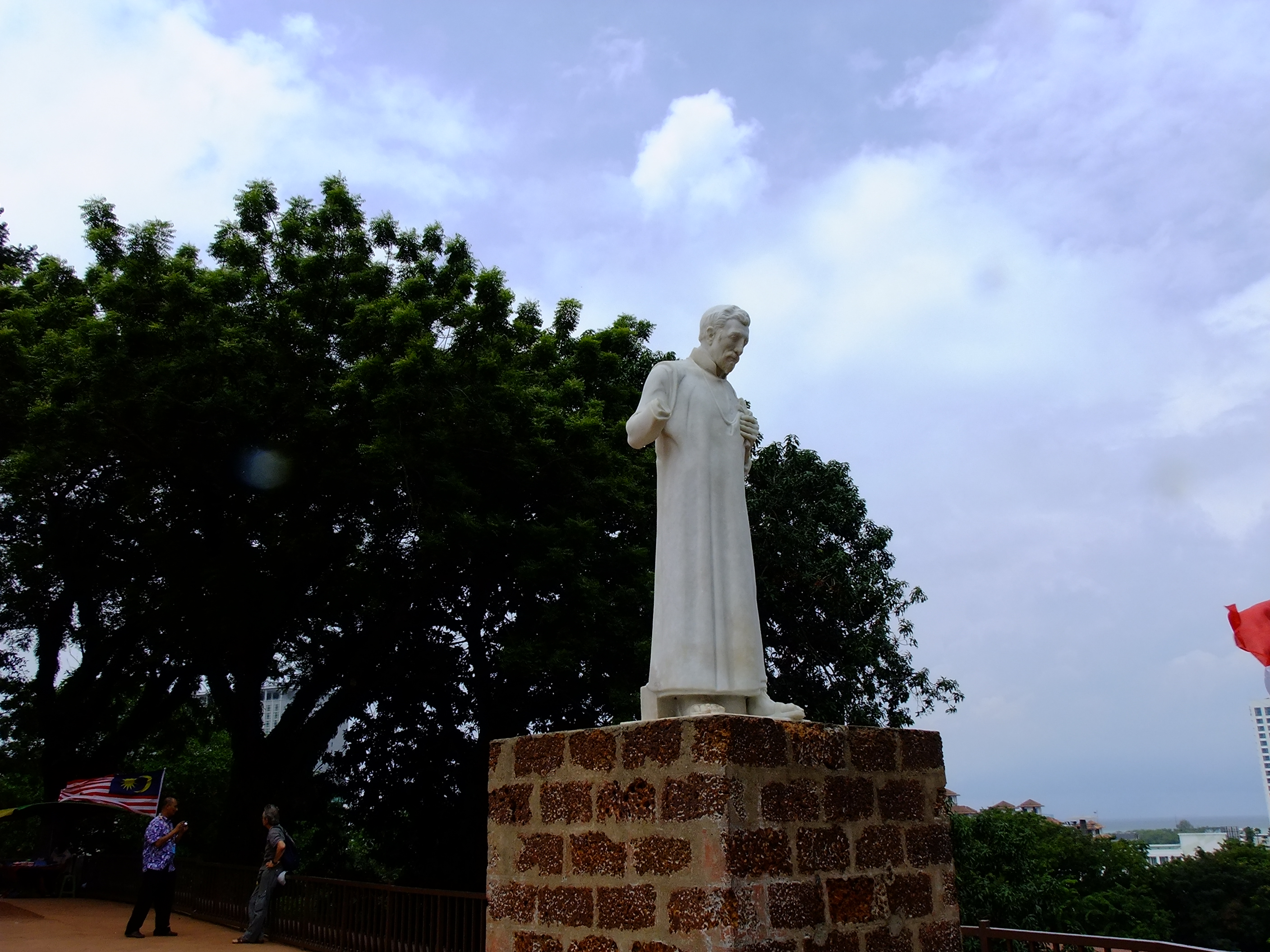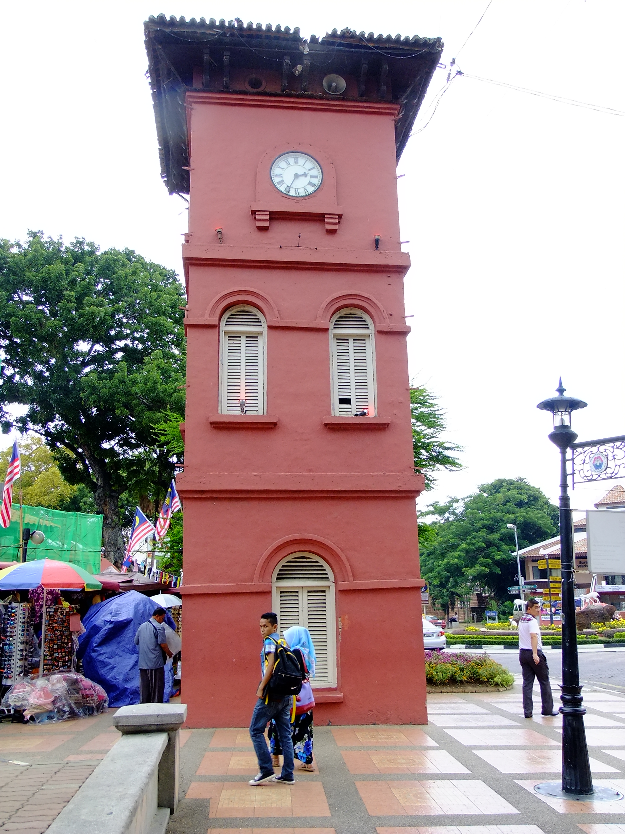 Dieses Glück wird leider dadurch getrübt, dass es anfängt zu regnen. Zwischendurch klart es immer wieder auf, dann verdunstet alles erneut und die Luftfeuchtigkeit steigt entsprechend. Somit ist es ein umso größerer Vorteil, dass die zurückzulegenden Wege nicht so weit sind. Zunächst genieße ich das Panorama am Melaka-Fluss, dann erreiche ich die Christ Church aus dem Jahre 1753 und das Stadthuys, welches gerade renoviert wird und deshalb völlig eingerüstet ist. Die Kirche ist ziegelrot, wie viele historische Gebäude der Stadt. Weiter geht die Tour am Uhrturm vorbei und am Fuß des St. Paul's Hill entlang. Ich sehe dort mehrere alte Kolonialbauten, die meist Museen beherbergen. Schließlich besteige ich den Hügel und besichtige die Ruine der Paulskirche, in der einige alte, niederländische Grabsteine zu sehen sind. Oben weht ein frischer Wind, der die extrem schwüle Witterung etwas erträglicher macht, und man hat einen guten Blick auf das nahe gelegene Meer. Von hier aus führt ein enger Weg hinab zum niederländischen Friedhof. Von den Gräbern, nach denen er benannt ist, sind allerdings kaum noch Relikte zu sehen. Die weißen Grabmale, die man sehen kann, stammen alle aus der britischen Kolonialzeit.