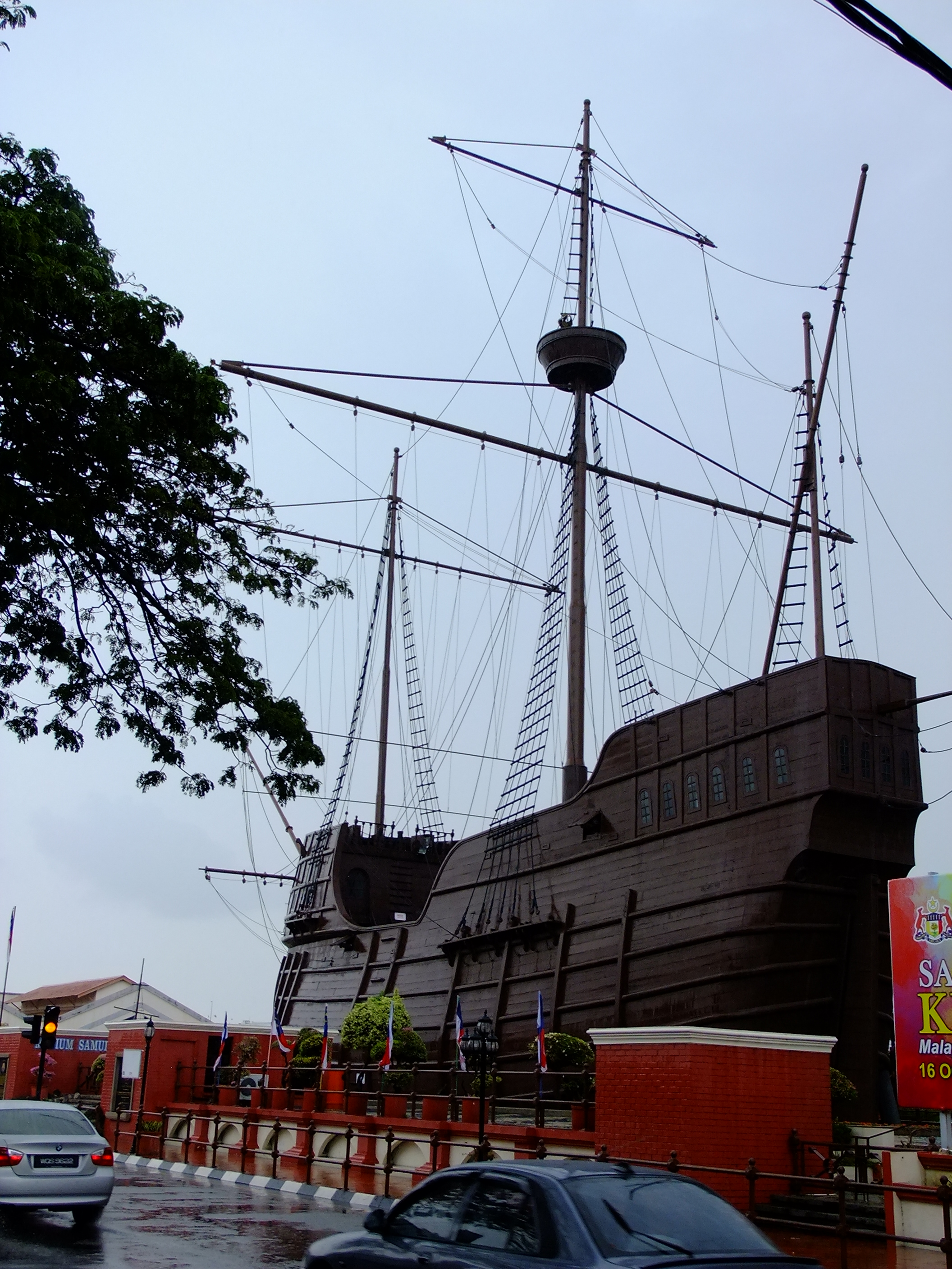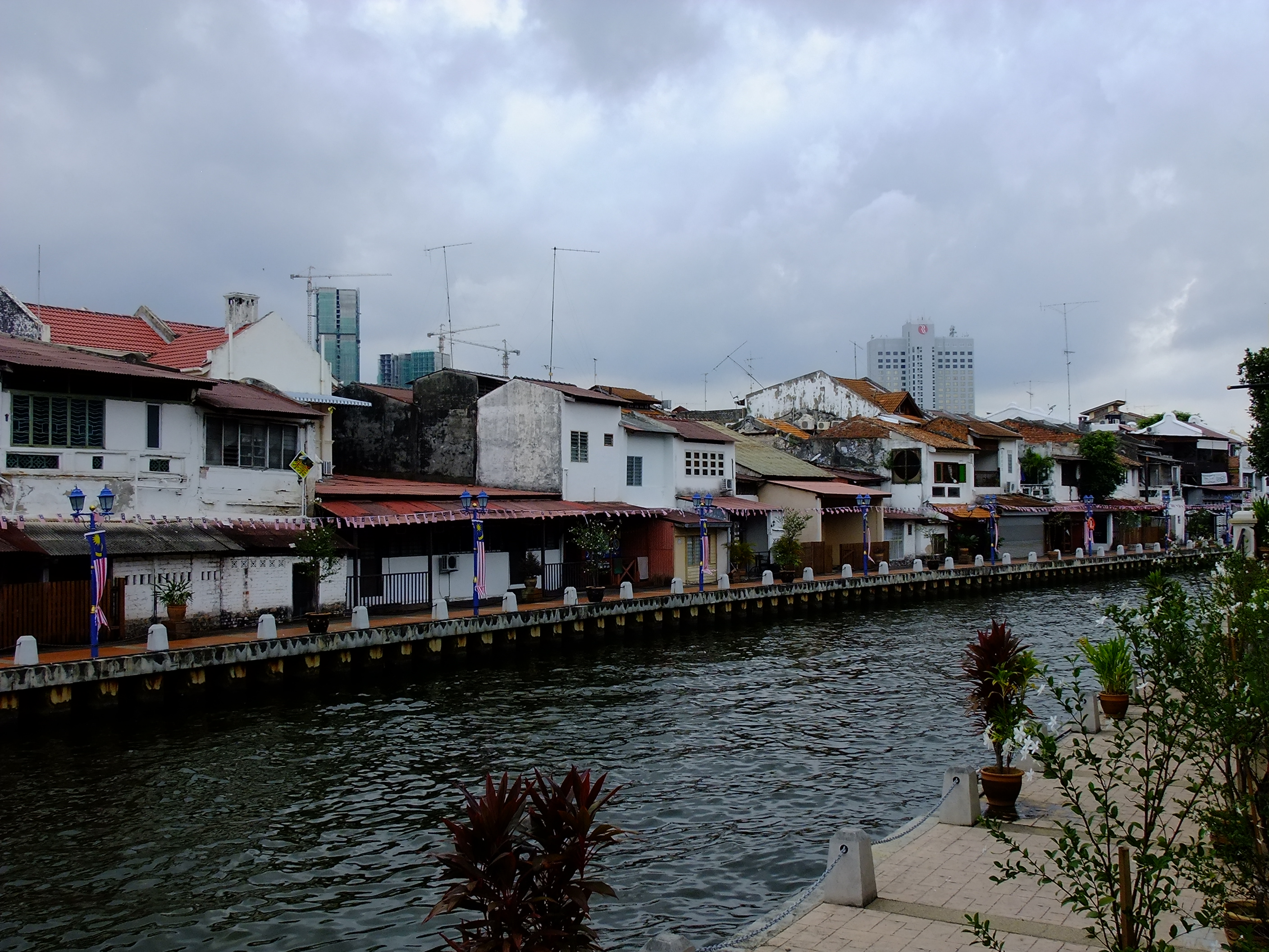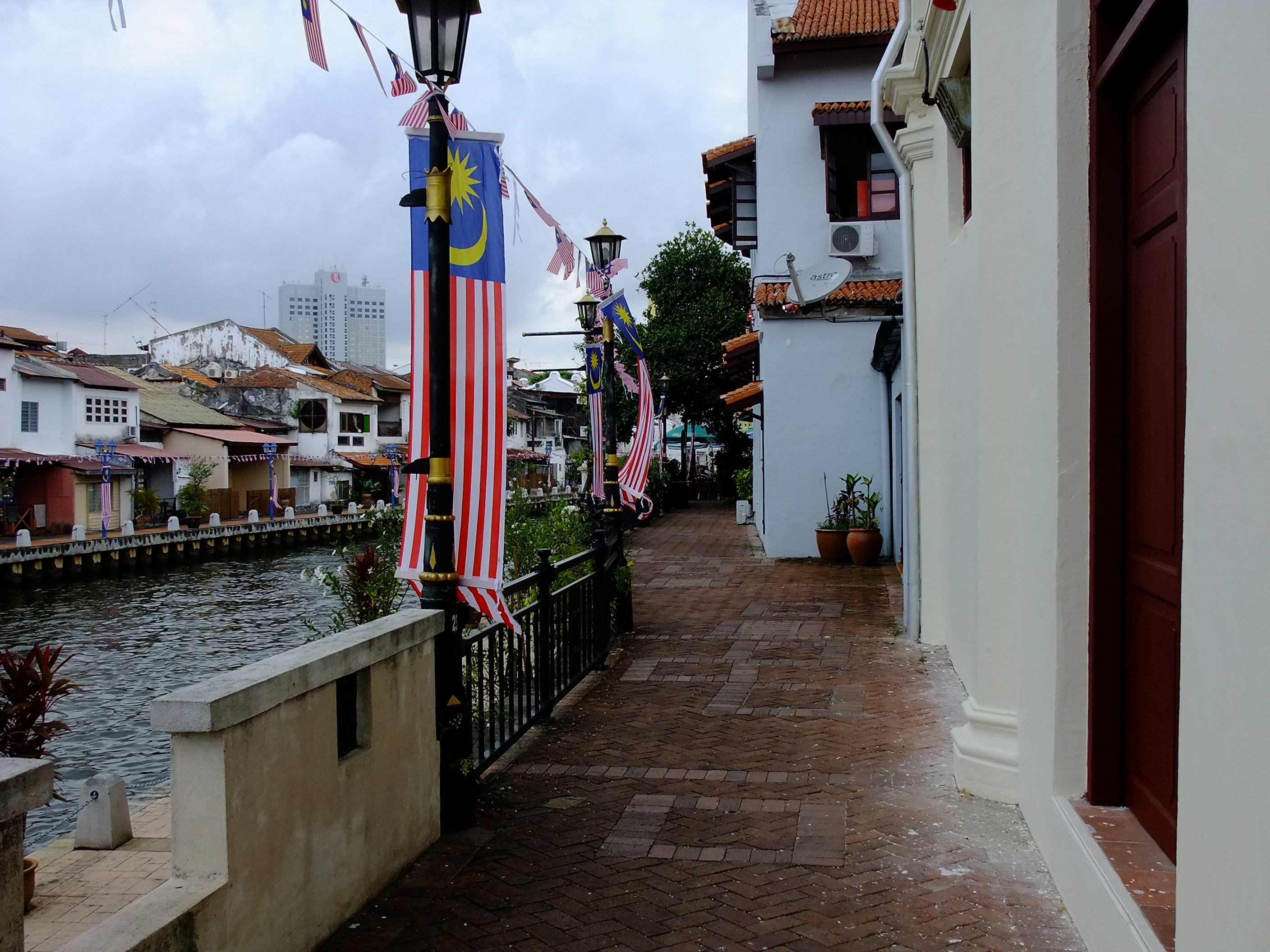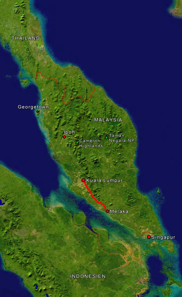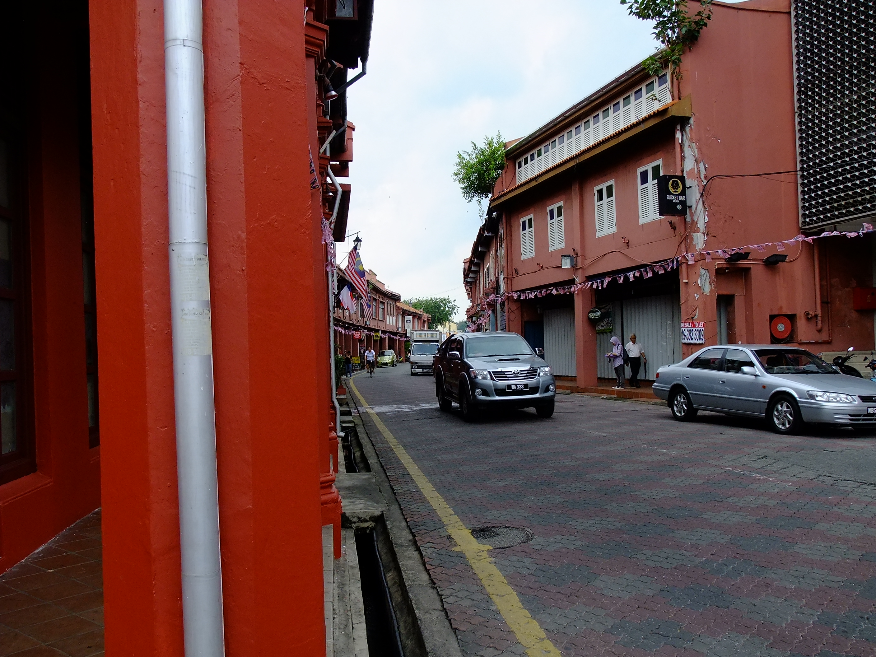 Ich erreiche schließlich die Autobahn E2, die nicht allzu weit von der Westküste der Halbinsel entfernt verläuft. Sie ist in jeder Fahrtrichtung dreispurig ausgebaut, wie alle Autobahnen des Landes mautpflichtig, und in sehr gutem Zustand. Da man nur maximal 110 km/h fahren darf, kommt man allerdings nicht besonders schnell voran. Für die etwa 150 Kilometer nach Melaka brauche ich insgesamt fast zweieinhalb Stunden. Die letzten etwa 15 Kilometer verlaufen durch chaotischen Vorstadtverkehr. In Melaka finde ich zum Glück ganz nahe am historischen Zentrum einen Parkplatz für gerade einmal 2 Ringgit. Von dort aus kann man alles Sehenswerte bequem zu Fuß erreichen.